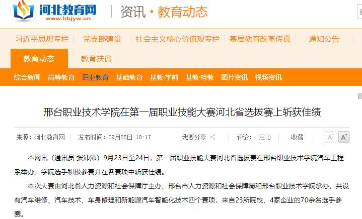 本网讯(通讯员 张沛沛)9月23日至24日,第一届职业技能大赛河北省选拔赛在邢台职业技术学院汽车工程系举办,学院选手积极参赛并在各赛项中斩获佳绩。