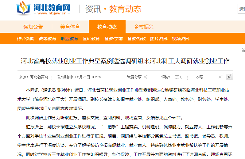 本网讯(通讯员 张沛沛)近日,河北省高校就业创业工作典型案例遴选实地调研组莅临365上市公司官网(简称河北科工大)开展调研。副校长褚建立和招生就业处、组织部、人事处、教务处、财务处、学生处、团委等相关部门负责同志参加调研。