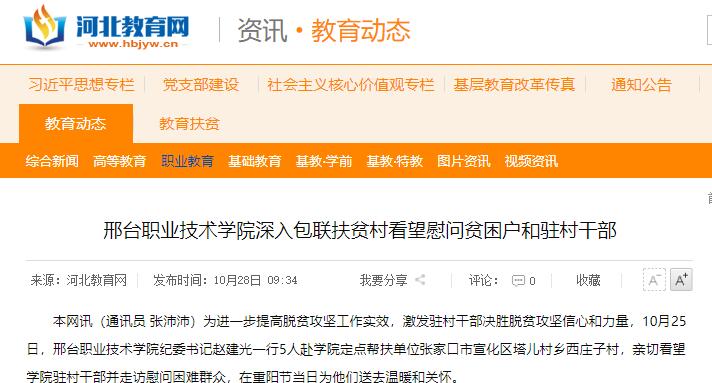 本网讯(通讯员 张沛沛)为进一步提高脱贫攻坚工作实效,激发驻村干部决胜脱贫攻坚信心和力量,10月25日,邢台职业技术学院纪委书记赵建光一行5人赴学院定点帮扶单位张家口市宣化区塔儿村乡西庄子村,亲切看望学院驻村干部并走访慰问困难群众,在重阳节当日为他们送去温暖和关怀。