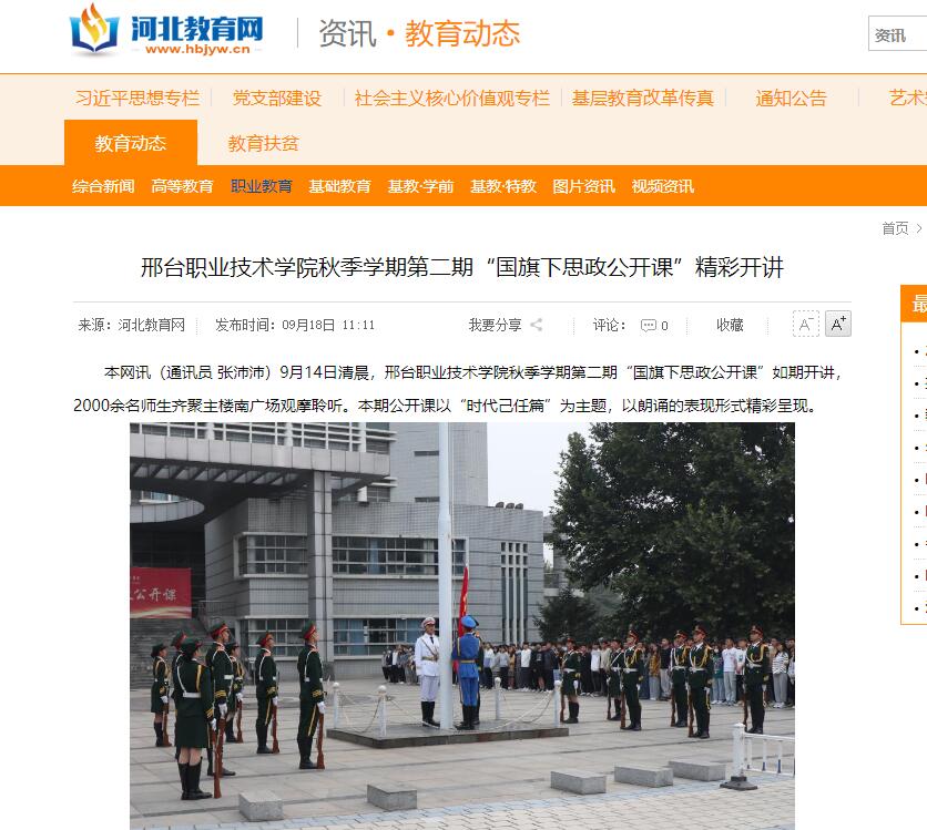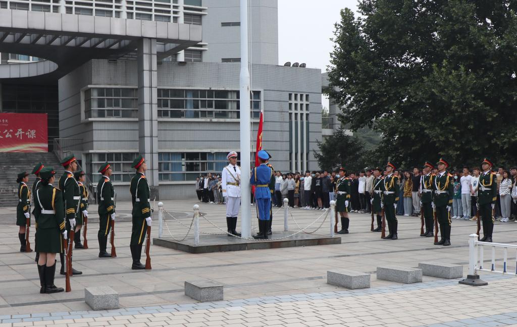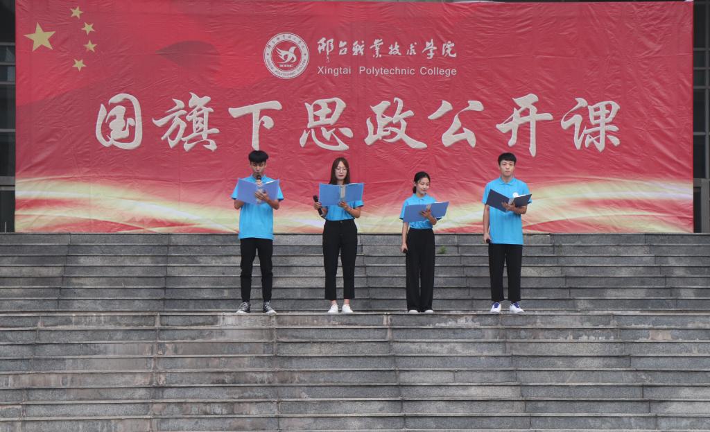 本网讯(通讯员 张沛沛)9月14日清晨,邢台职业技术学院秋季学期第二期“国旗下思政公开课”如期开讲,2000余名师生齐聚主楼南广场观摩聆听。本期公开课以“时代己任篇”为主题,以朗诵的表现形式精彩呈现。