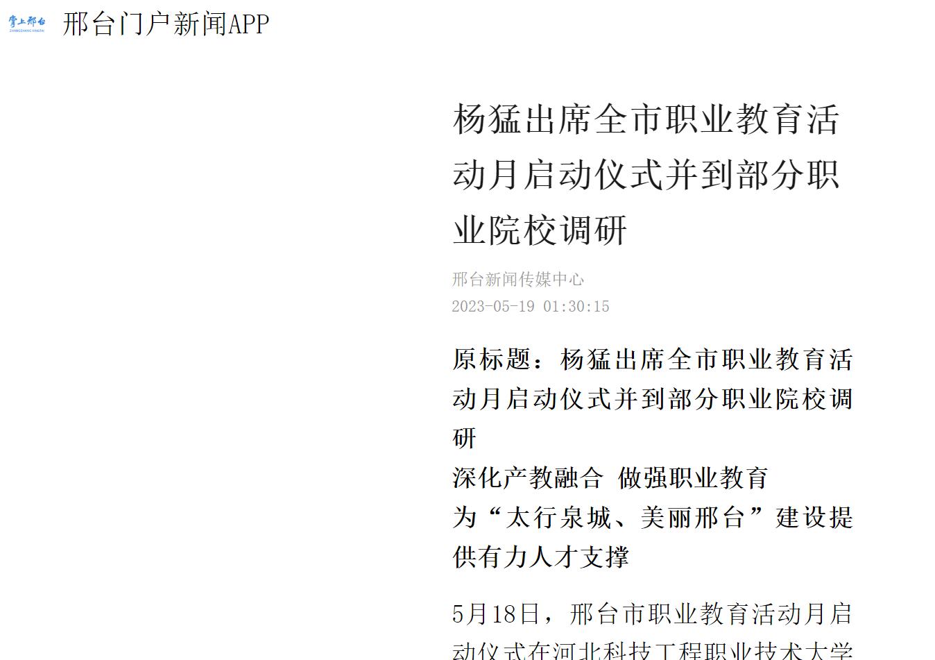原标题:杨猛出席全市职业教育活动月启动仪式并到部分职业院校调研 深化产教融合 做强职业教育 为“太行泉城、美丽邢台”建设提供有力人才支撑