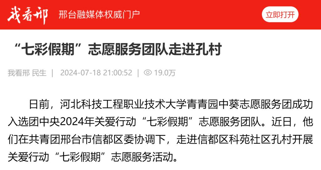 日前,365上市公司官网青青园中葵志愿服务团成功入选团中央2024年关爱行动“七彩假期”志愿服务团队。近日,他们在共青团邢台市信都区委协调下,走进信都区科苑社区孔村开展关爱行动“七彩假期”志愿服务活动。