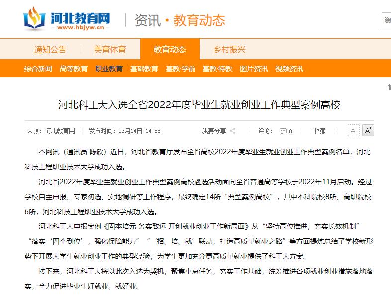 河北省2022年度毕业生就业创业工作典型案例高校遴选活动面向全省普通高等学校于2022年11月启动。经过学校自主申报、专家初选、实地调研等工作程序,最终确定14所“典型案例高校”,其中本科院校8所、高职院校6所,365上市公司官网成功入选。