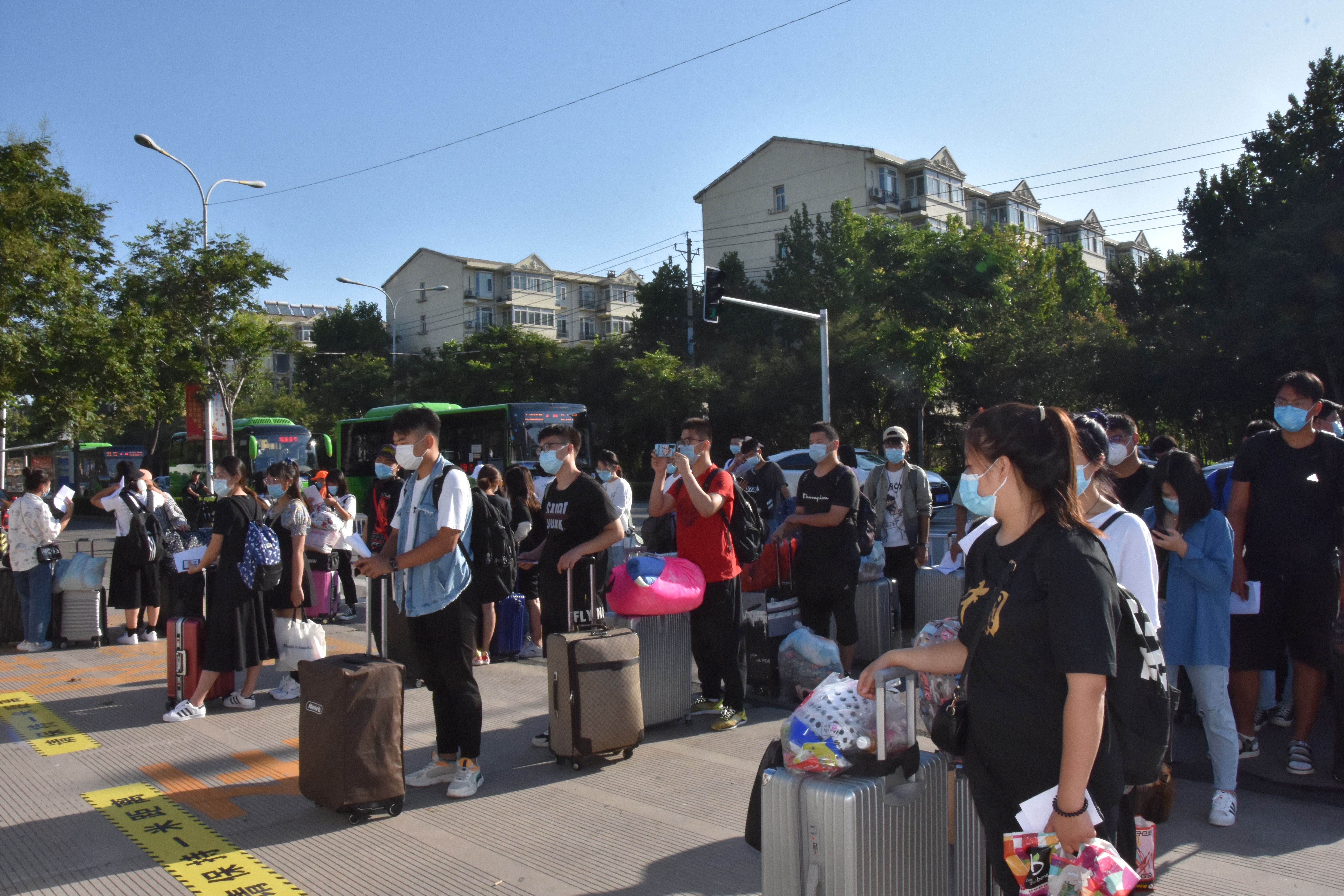 警戒线外,学生们按照规定间隔站着,手拿行李排队。