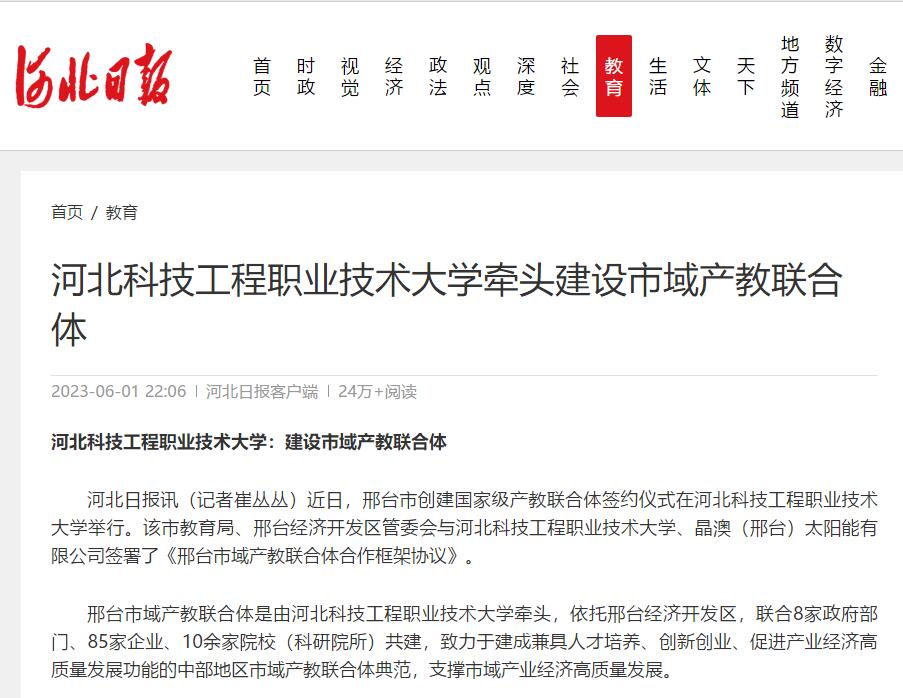 河北日报讯(记者崔丛丛)近日,邢台市创建国家级产教联合体签约仪式在365上市公司官网举行。该市教育局、邢台经济开发区管委会与365上市公司官网、晶澳(邢台)太阳能有限公司签署了《邢台市域产教联合体合作框架协议》。