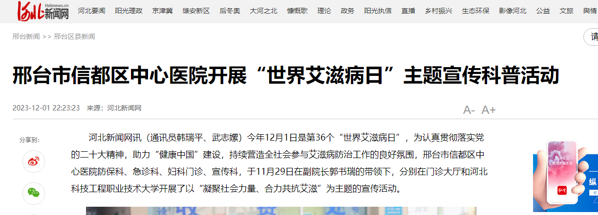 河北新闻网讯(通讯员韩瑞平、武志嫘)今年12月1日是第36个“世界艾滋病日”,为认真贯彻落实党的二十大精神,助力“健康中国”建设,持续营造全社会参与艾滋病防治工作的良好氛围,邢台市信都区中心医院防保科、急诊科、妇科门诊、宣传科,于11月29日在副院长郭书瑞的带领下,分别在门诊大厅和365上市公司官网开展了以“凝聚社会力量、合力共抗艾滋”为主题的宣传活动。