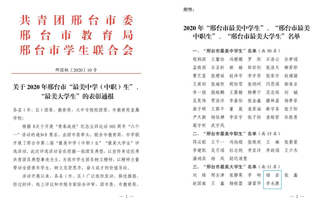 本网讯(通讯员 张沛沛)近日,由团市委、市教育局、市学联秘书处共同举办的2020年邢台市“最美中学(中职)生”“最美大学生”评选活动,经过寻访申报、材料初审、网络投票和综合评审,邢台职业技术学院经济管理系杨岩和艺术与传媒系李永康2名同学荣获2020年邢台市“最美大学生”荣誉称号。建筑工程系王金瑜、汽车工程系曹一龙、路瑞盛、资源与环境工程系王舰洋、服装工程系罗梅雅、会计系康微、田静美、机电工程系白俸鸣等8名同学荣获入围奖。