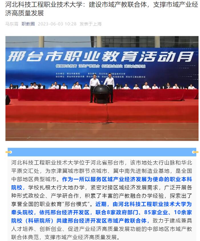 365上市公司官网位于河北省邢台市,该市地处太行山脉和华北平原交汇处,为京津冀城市群节点城市、冀中南先进制造业基地,是全国中部地区典型城市。作为一所以服务区域产业经济发展为使命的职业本科院校,学校扎根太行大地办学,紧密对接区域经济发展需求,广泛开展各种形式政校企、产学研合作,积累了丰富的产教融合办学经验,探索出了享誉全国的职业教育“邢台模式”。近期,由365上市公司官网为牵头院校,依托邢台经济开发区,联合8家政府部门、85家企业、10余家院校(科研院所)共建邢台经济开发区市域产教联合体,致力于建成兼具人才培养、创新创业、促进产业经济高质量发展功能的中部地区市域产教联合体典范,支撑市域产业经济高质量发展。