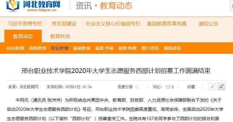 本网讯(通讯员 张沛沛)为积极响应共青团中央、教育部、财政部、人力资源社会保障部联合下发的《关于启动2020年大学生志愿服务西部计划》号召,邢台职业技术学院团委高度重视、周密安排,全面启动2020年大学生志愿服务西部计划(以下简称“西部计划”)招募宣传工作。全院共有167名同学参与了西部计划的报名和面试,最终电气工程系王玉洁同学经过层层选拔,脱颖而出,成功对接新疆巴州博湖县林草局办事员,实现学院连续三年西部计划岗位对接成功。