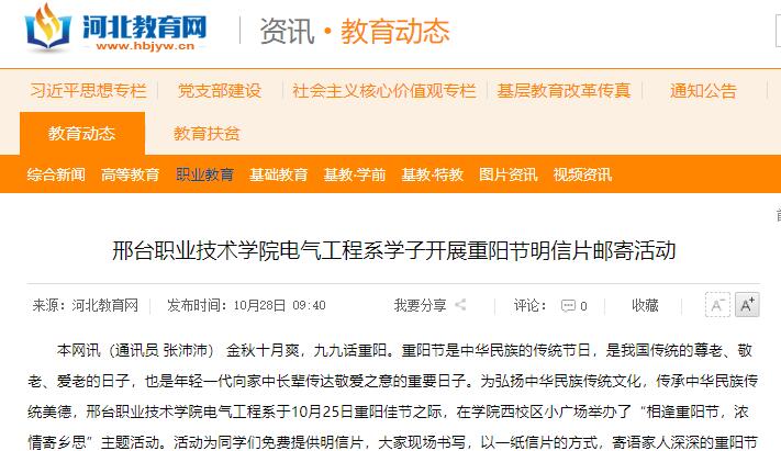 本网讯(通讯员 张沛沛) 金秋十月爽,九九话重阳。重阳节是中华民族的传统节日,是我国传统的尊老、敬老、爱老的日子,也是年轻一代向家中长辈传达敬爱之意的重要日子。为弘扬中华民族传统文化,传承中华民族传统美德,邢台职业技术学院电气工程系于10月25日重阳佳节之际,在学院西校区小广场举办了“相逢重阳节,浓情寄乡思”主题活动。活动为同学们免费提供明信片,大家现场书写,以一纸信片的方式,寄语家人深深的重阳节祝福。