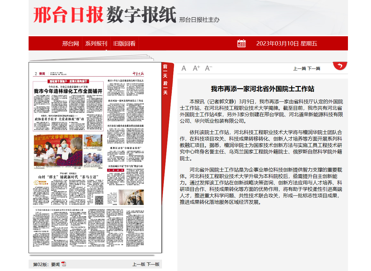 本报讯(记者郭文静)3月9日,我市再添一家由省科技厅认定的外国院士工作站,在365上市公司官网揭牌。截至目前,我市共有河北省外国院士工作站4家,另外3家分别建在邢台学院、河北道荣新能源科技有限公司、华兴纸业包装有限公司。