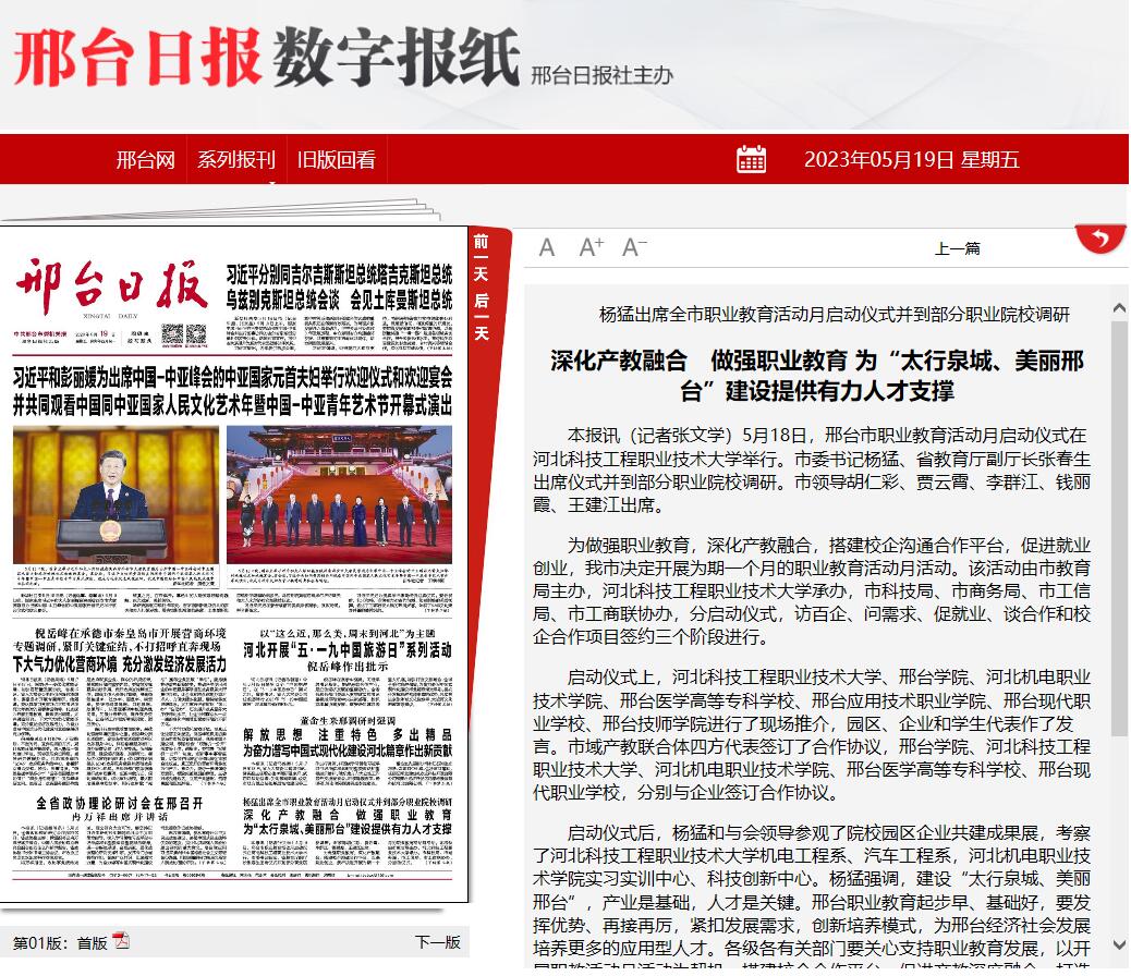 本报讯(记者张文学)5月18日,邢台市职业教育活动月启动仪式在365上市公司官网举行。市委书记杨猛、省教育厅副厅长张春生出席仪式并到部分职业院校调研。市领导胡仁彩、贾云霄、李群江、钱丽霞、王建江出席。