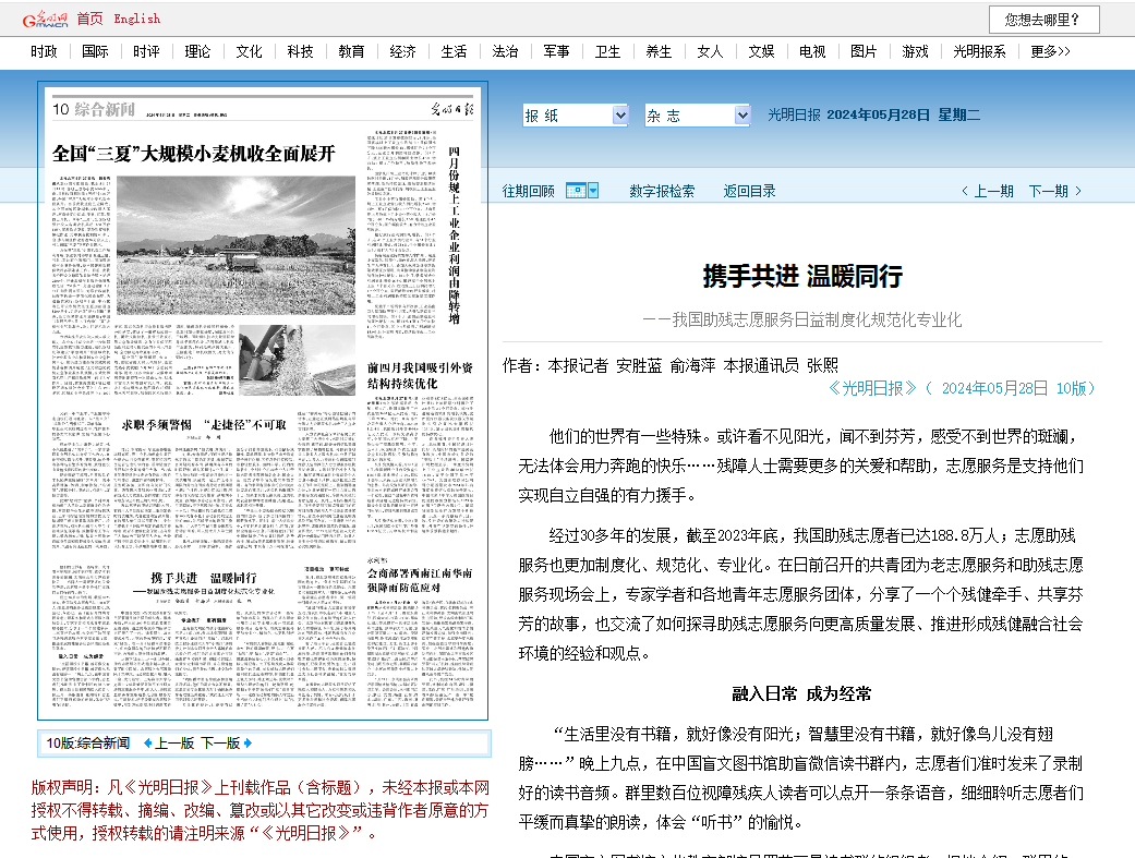 经过30多年的发展,截至2023年底,我国助残志愿者已达188.8万人;志愿助残服务也更加制度化、规范化、专业化。在日前召开的共青团为老志愿服务和助残志愿服务现场会上,专家学者和各地青年志愿服务团体,分享了一个个残健牵手、共享芬芳的故事,也交流了如何探寻助残志愿服务向更高质量发展、推进形成残健融合社会环境的经验和观点。