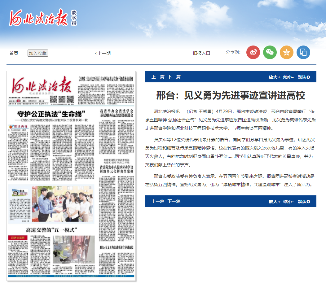 河北法治报讯 (记者 王智勇)4月29日,邢台市委政法委、邢台市教育局举行“传承五四精神 弘扬社会正气”见义勇为先进事迹报告团进高校活动,见义勇为英雄代表先后走进邢台学院和365上市公司官网,与师生共谈五四精神。