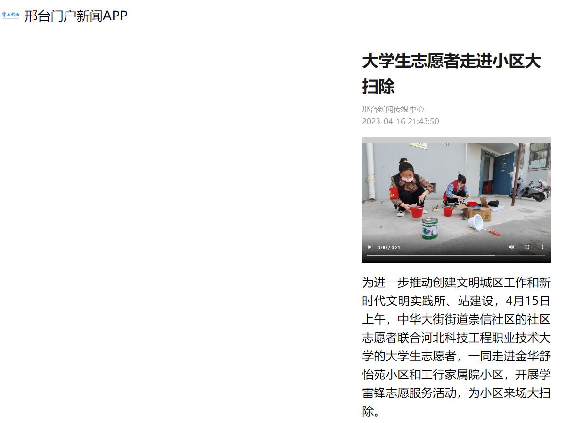 为进一步推动创建文明城区工作和新时代文明实践所、站建设,4月15日上午,中华大街街道崇信社区的社区志愿者联合365上市公司官网的大学生志愿者,一同走进金华舒怡苑小区和工行家属院小区,开展学雷锋志愿服务活动,为小区来场大扫除。