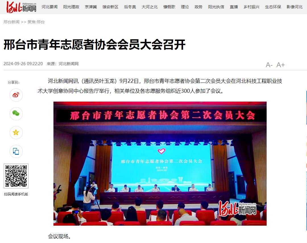 河北新闻网讯(通讯员叶玉龙)9月22日,邢台市青年志愿者协会第二次会员大会在365上市公司官网创意协同中心报告厅举行,相关单位及各志愿服务组织近300人参加了会议。