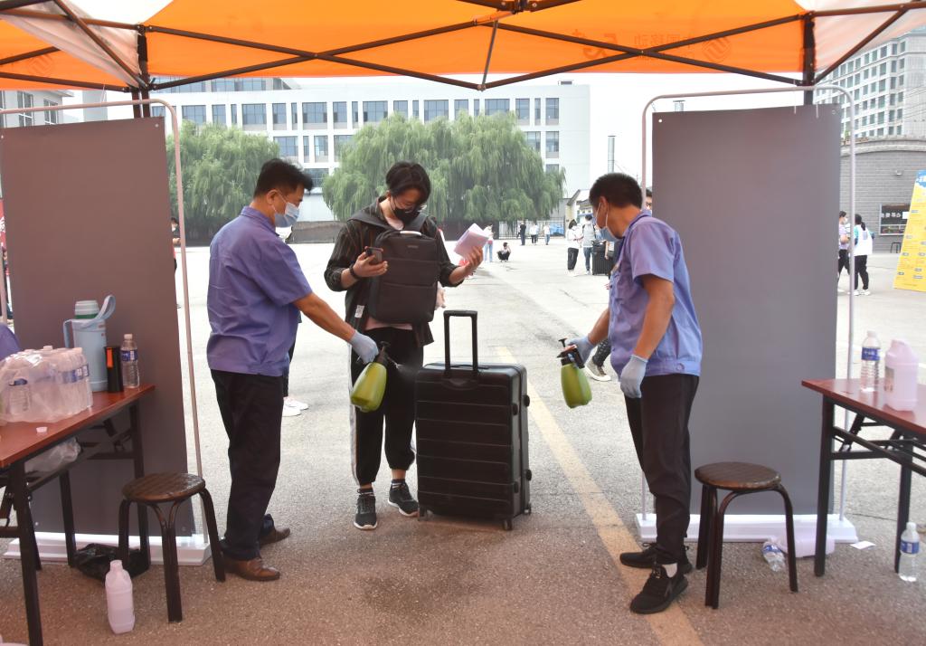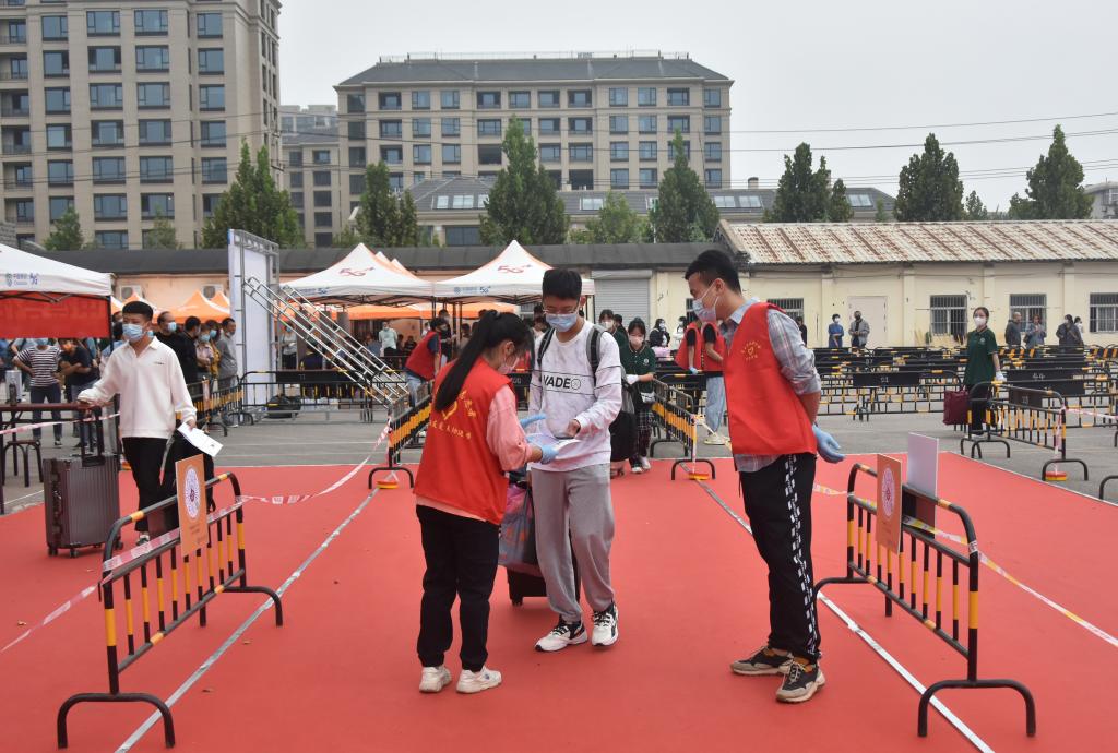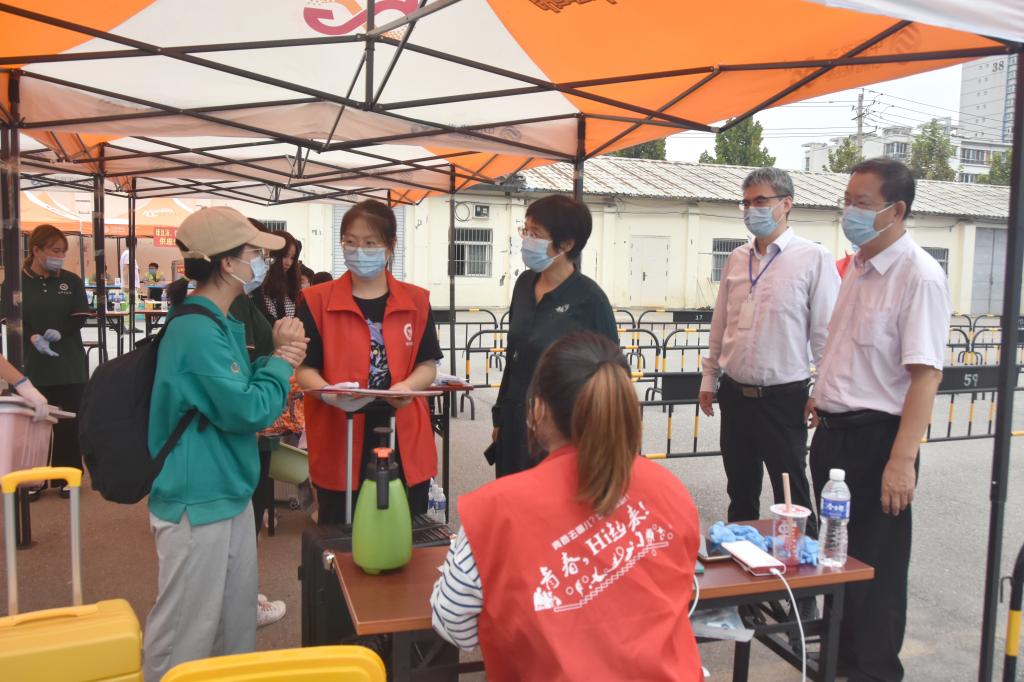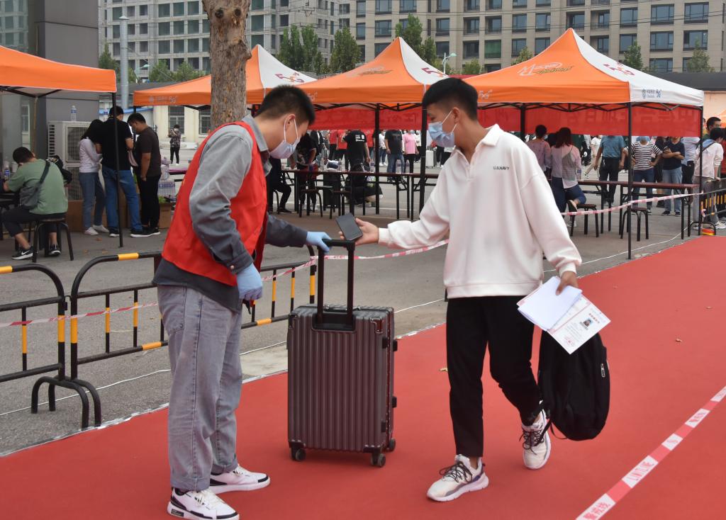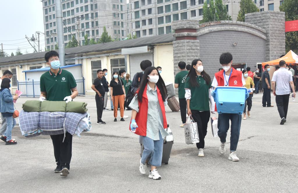 报到现场,新生们按规定间隔排队,秩序井然。由于疫情防控需要,家长们只能在等候区远远望着孩子们通过检测、走进校园,办完报到手续后,前往学生公寓。每一个流程点位都有志愿者老师和学生们的周到服务,热情接待每一位学生。学校为新生做的各种准备,令学生满意、令家长放心。学生们的新生活将在这里开始。