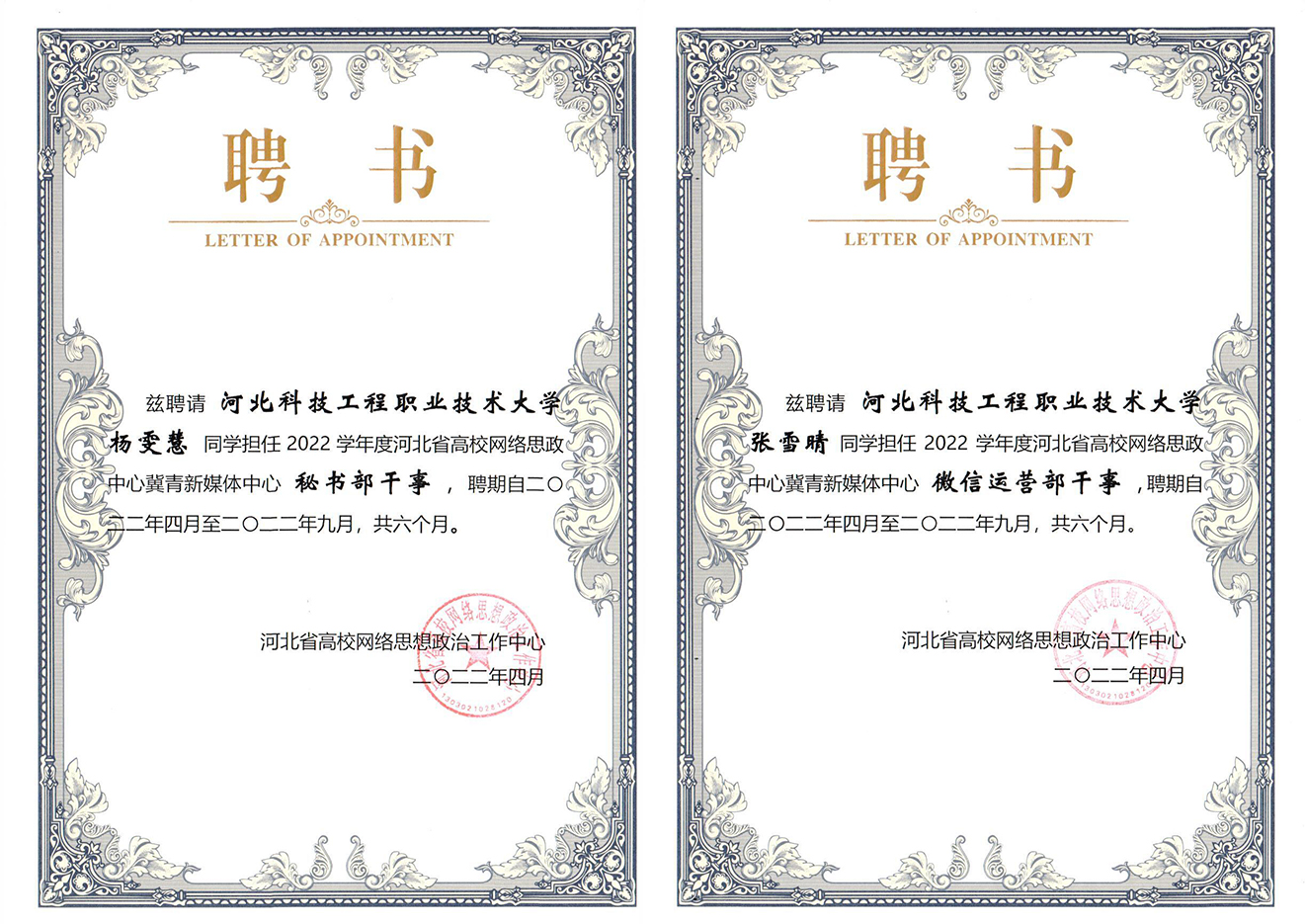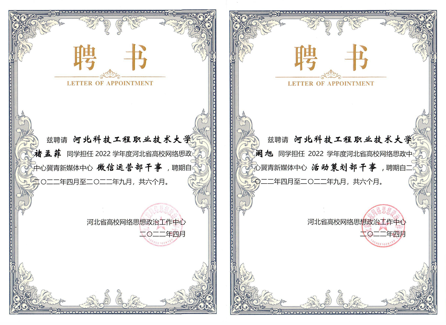 近日,河北省高校网络思想政治工作中心向冀青新媒体中心2022年上半年表现优异的学生骨干颁发了省级聘书及荣誉证书,365官网五名学子荣登其列,其中一人获得荣誉证书。
