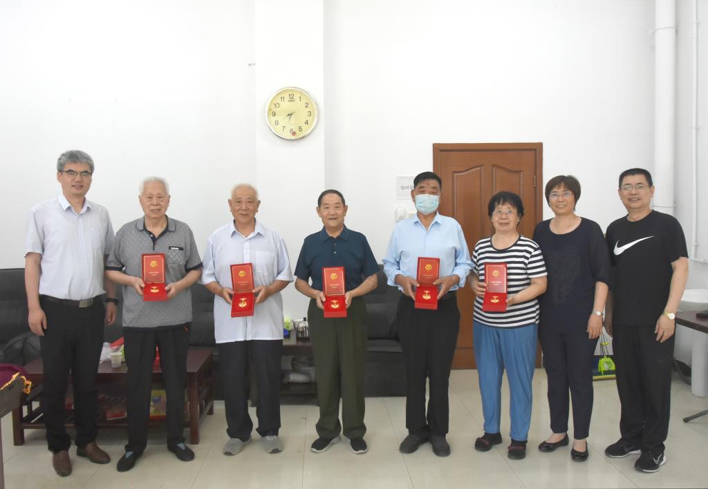 在建党102周年到来之际,6月27日下午,校党委书记刘彩琴在学校离退休党总支活动中心为老党员颁发“光荣在党50年”纪念章。校党委委员、组织部部长魏勇、离退休党总支书记王东亮参加活动。