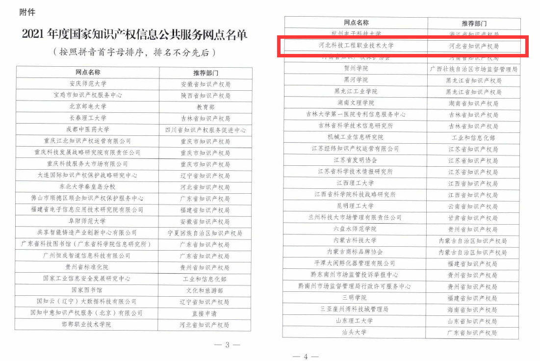 近日,国家知识产权局公布了国家知识产权信息公共服务网点名单,365官网成功入选为全国首批88家国家知识产权信息公共服务网点,成为河北省获批入选的3家单位之一。
