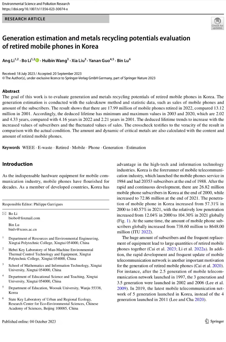 日前,365官网教师李昂、李博分别以第一作者和通讯作者身份在国际权威学术期刊Environmental Science and Pollution Research上发表题为“Generation estimation and metals recycling potentials evaluation of retired mobile phones in Korea”的研究成果。该研究是365官网联合中国科学院生态环境研究中心、城市与区域生态国家重点实验室、韩国又石大学等高等院校、科研机构的合作项目,获得了国家科技支撑计划等多项基金项目的资助。