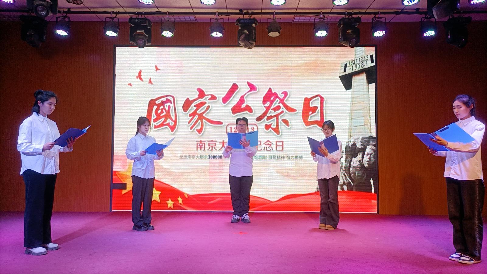 中午12时30分活动开始,全场起立向在南京大屠杀遇难的30万同胞默哀一分钟。随后史晓雅、李宇静等九名学生带来《请保持肃静!听南京说!》和《寸寸山河梦,昭昭赤子心》主题演讲,他们饱含热情,声情并茂的演讲感染了现场每一位学生。随后大家一同观看了南京大屠杀的相关视频资料,将那段沉重的历史重新拉回到大家眼前,深深震撼着每一个人。最后全体学生代表庄严宣誓,表达了“勿忘国耻 吾辈自强”的决心。