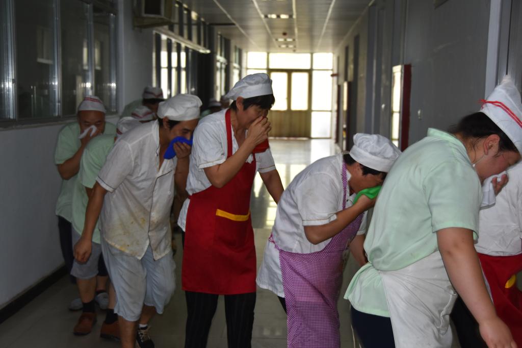随着警报响起,饮食服务中心全体员工立即启动火灾应急处置程序,微型消防站人员及食堂管理人员迅速到位并进行指挥,断电、断气、救火,各项工作同时进行,有条不紊,随后所有人员用湿毛巾堵住口鼻弯腰前行,有序撤出食堂。通过演练,食堂员工了解了消防安全应急流程、掌握逃生路线,增强了消防安全意识,收到显著效果。