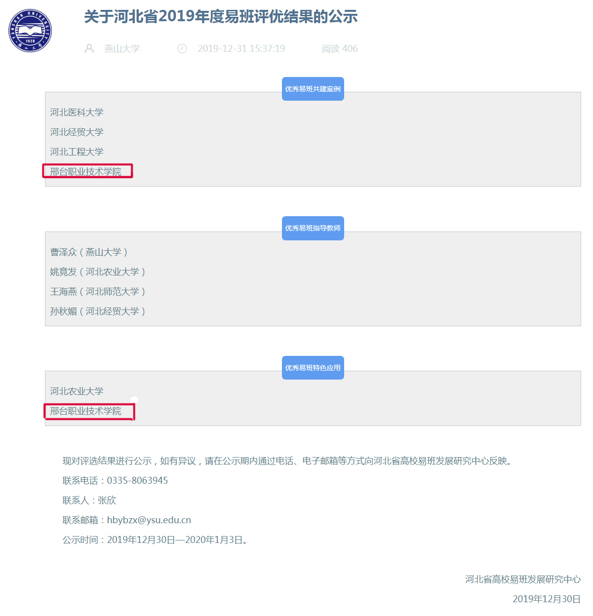 近日,河北省2019年度易班评优结果发布。我院“国旗下思政公开课”荣获“优秀易班共建案例”、“晚点名”应用荣获“优秀易班特色应用”。这是我院继荣获2019年全国高校易班技术创新大会创新创意类三等奖、入围2019年全国易班共建高校埋点专题参与度百强之后,在省级易班评选中又获佳绩。
