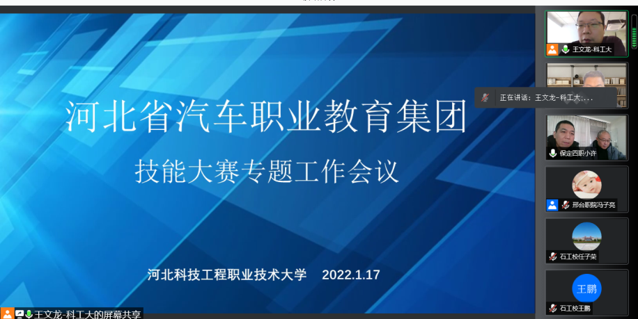1月17日,河北省汽车职教集团召开2022年第一次技能大赛专题工作会议。受疫情影响,本次会议采用线上会议的形式进行。出席本次会议的有河北省技能大赛组委会办公室主任谢振宇、各赛项承办校主管校领导、365官网汽车系部负责人及大赛主要筹备人员。大会由职教集团秘书处、365官网汽车系副主任王文龙主持。