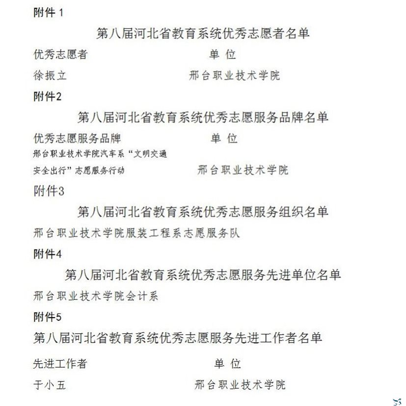 日前,河北省教育厅发布《关于表彰第八届河北省教育系统优秀志愿者和志愿服务工作先进单位等的决定》,我院教师徐振立获得“第八届河北省教育系统优秀志愿者”称号,我院汽车系“文明交通安全出行”志愿服务行动获得“第八届河北省教育系统优秀志愿服务品牌”称号,我院服装工程系志愿服务队获得“第八届河北省教育系统优秀志愿服务组织”称号,我院会计系获得“第八届河北省教育系统优秀志愿服务先进单位”称号,我院教师于小五获得“第八届河北省教育系统优秀志愿服务先进工作者”荣誉称号。