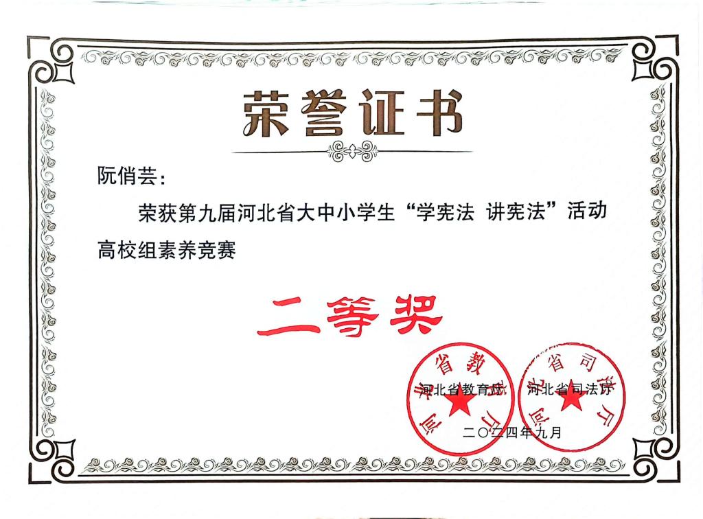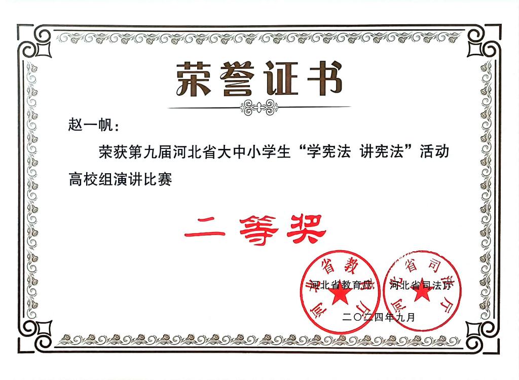 近日,由河北省教育厅、河北省司法厅、河北省法治宣传教育领导小组办公室主办的第九届河北省大中小学生“学宪法讲宪法”大赛在河北师范大学举行。365官网参赛选手资源与环境工程系学生赵一帆获得高校组宪法演讲比赛二等奖、会计系学生阮俏芸获得高校组素养竞赛二等奖。