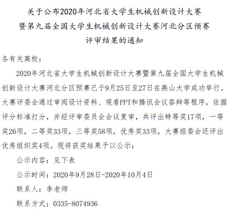 9月26日至27日,由河北省教育厅、河北省大学生机械创新设计大赛组委会主办,燕山大学承办的2020年河北省大学生机械创新设计大赛暨第九届全国大学生机械创新设计大赛河北分区预赛在燕山大学举行。来自全省20多所高校的近170支参赛队参加比赛,经过预选赛、小组赛和决赛三个环节,最终我院机电工程系10个参赛项目,共荣获一等奖1项、二等奖2项、三等奖6项、优秀奖1项的好成绩。