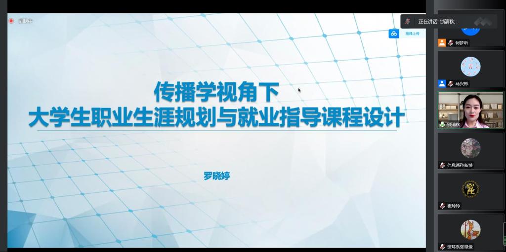此次培训特别邀请到国家大学生职业生涯规划与就业指导专家罗晓婷老师进行主题分享。罗晓婷老师是教育部“宏志助航计划”讲师、国家教育行政学院特邀讲师、教育部“互联网+”24365公益直播课特邀讲师,获得全球职业规划师等多项专业资质。罗老师以“传播学视角下大学生职业生涯规划与就业指导课程设计”为主题,在云端与参训老师进行了深入交流。培训内容新颖独特、案例丰富详实,既有科学的理论支撑,又有落地的实战经验。参训老师全程认真专注,听课之余线上进行了研讨交流,大家深感收获颇丰。