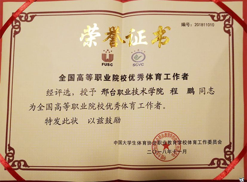 会上举行了全国高等职业院校第二批“一校一品”示范基地立项单位和全国高等职业院校优秀体育工作者获奖教师颁奖活动,我院体育工作部教师程鹏荣获2014-2017年度“全国高等职业院校优秀体育工作者”称号,并且作为河北省代表上台领奖。