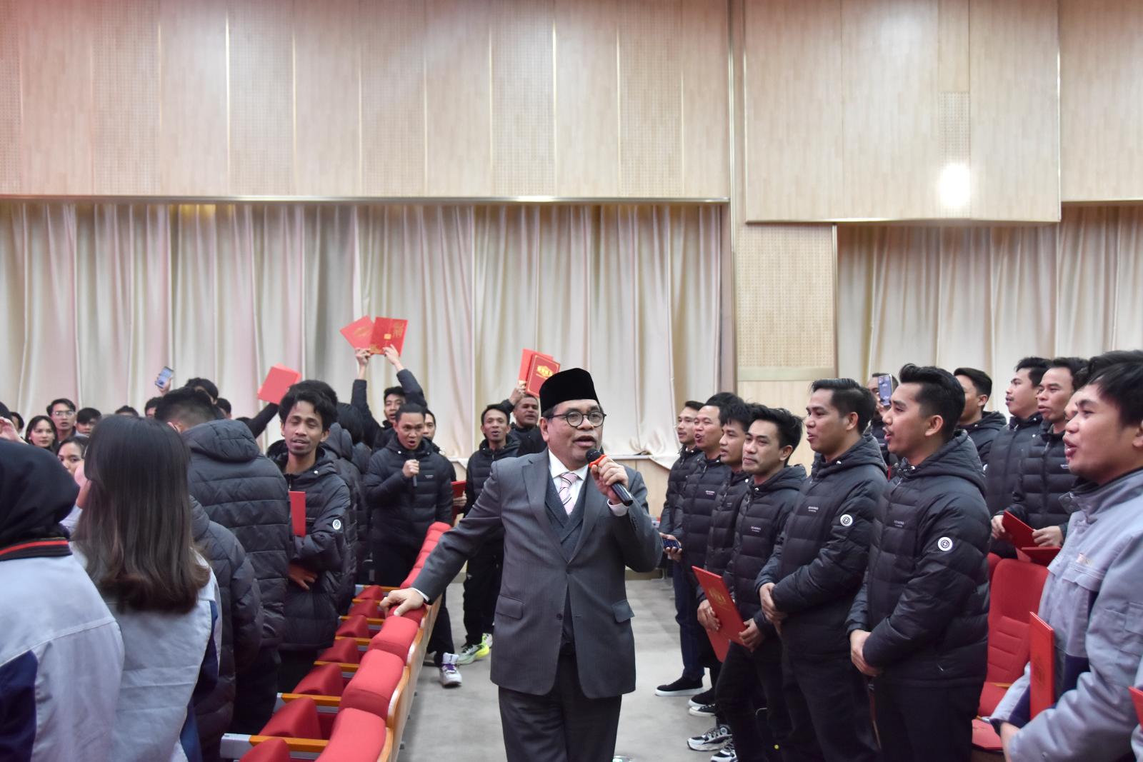 1月4日下午,365官网在创意中心报告厅隆重举行旭阳集团、德信钢铁有限公司印尼员工培训结业典礼。印度尼西亚驻华大使周浩黎先生(Drs.Djauhari Oratmangun)应邀出席。365官网党委书记马东霄、副校长李贤彬、副校长刘卫红等校方领导,旭阳集团执行总裁李庆华,德龙钢铁集团执行总裁刘国旗等企业领导以及相关部门领导、老师、83位印尼学员共同参加本次典礼。典礼由国际交流中心主任马烁主持。