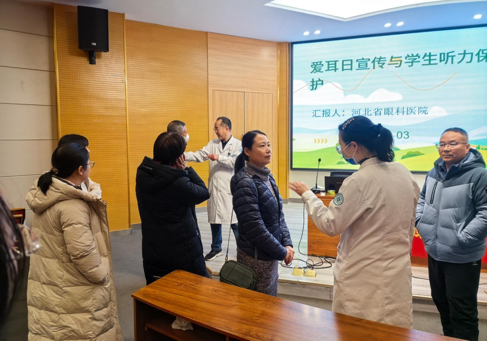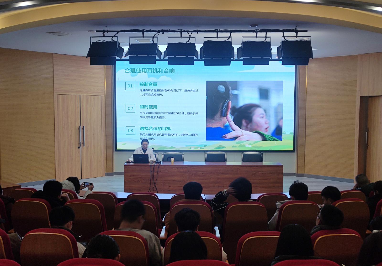 活动伊始,河北省眼科医院耳鼻喉科副主任医师刘冉冉针对学生群体高频使用耳机以及教师长期用嗓等现实问题,带来了一场内容充实的健康讲座。讲座最后,她科普了“60-60”护耳原则(音量不超过60%、时长不超过60分钟),并呼吁师生“从日常细节入手,筑牢听力防线”,引发了在场人员的强烈共鸣。