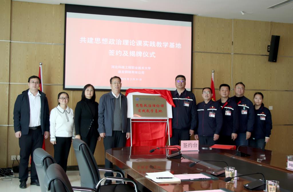 为全面推进“大思政课”建设,推动校企协同开发利用思政资源,努力开辟“党建+思政”新局面,3月31日,校党委副书记张双会、马克思主义学院院长祁凤华和部分教师代表一行赴德龙钢铁有限公司参加学校思想政治理论课实践教学基地挂牌仪式。德龙钢铁有限公司相关领导和负责人参加仪式。仪式由德龙钢铁有限公司党委副书记杨胜敏主持。