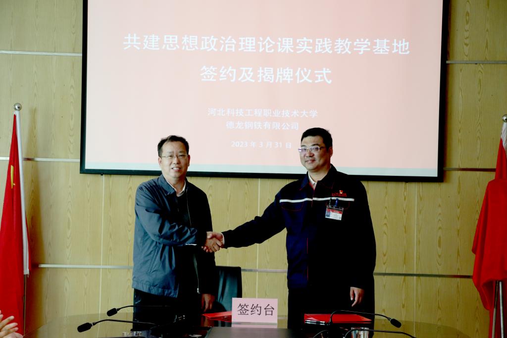 最后,双方重点就合作的内容、形式等事宜进行研讨,签订共建思想政治理论课实践教学基地协议书并举行揭牌仪式。365官网一行参观了德龙钢铁有限公司的“邢台市信都区劳动公园”“德龙钢铁博物馆”“党建通廊”等地,切身感受到浓厚的企业文化、钢铁文化和党建文化。