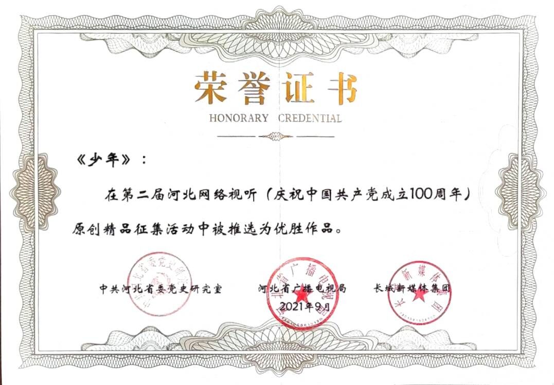 9月7日,第二届河北网络视听(庆祝中国共产党成立100周年)原创精品征集活动成果发布仪式在2021年中国国际数字经济博览会——数字文化产业创新高峰论坛上举行。经过征集活动推选委员会审议,学校报送作品MV《少年》突出重围被推选为优胜作品,并被收录进征集成果目录。