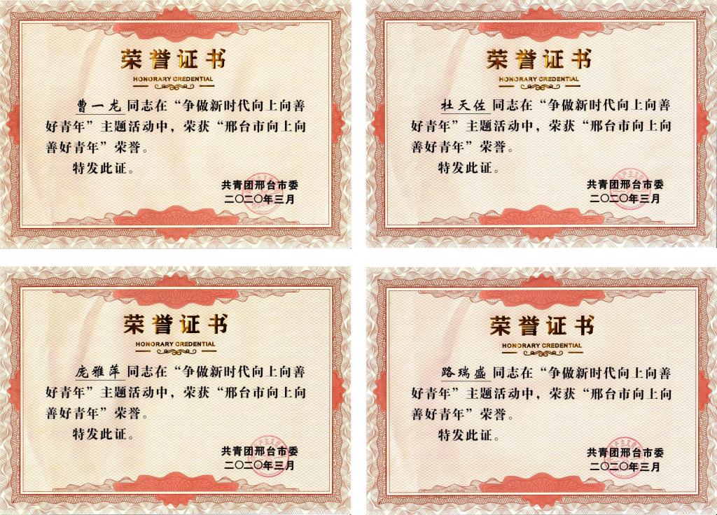 近日,由共青团邢台市委组织的“争做新时代向上向善好青年”评选活动结果揭晓,我院曹一龙、路瑞盛、庞雅萍、杜天佐四位同学分别被评为爱岗敬业类、勤学上进类、诚实守信类“邢台市向上向善好青年”,曹晨磊同学获得推荐参评省级荣誉称号的资格。