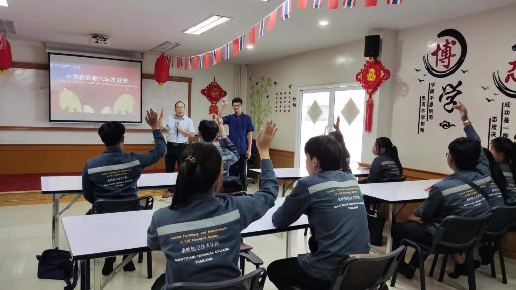 张华老师深厚的专业知识功底得到了泰国素叻他尼技术学院师生的一致认可。他表示,“素叻他尼技术学院的新能源汽车专业处于起步阶段,师资、设备等各项条件尚需完善。365官网的新能源汽车专业是优势专业,希望能通过此次教学,帮助素叻他尼技术学院师生学到更多新能源汽车相关知识,促进365官网优势专业对外输出,扩大学校国际影响力,搭建中泰合作的桥梁。”教学期间,张华老师随素叻他尼技术学院师生到长城汽车泰国分公司实地访问,深入了解企业用人需求。