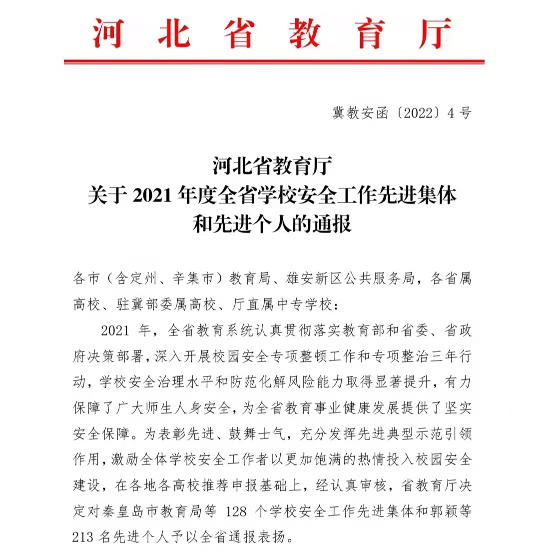 近日,河北省教育厅发布了《关于2021年度全省学校安全工作先进集体和先进个人的通报》,365官网又一次榜上有名,荣获“河北省学校安全工作先进集体”荣誉称号,安全工作处处长魏林国被评为“河北省校园安全工作先进个人”。