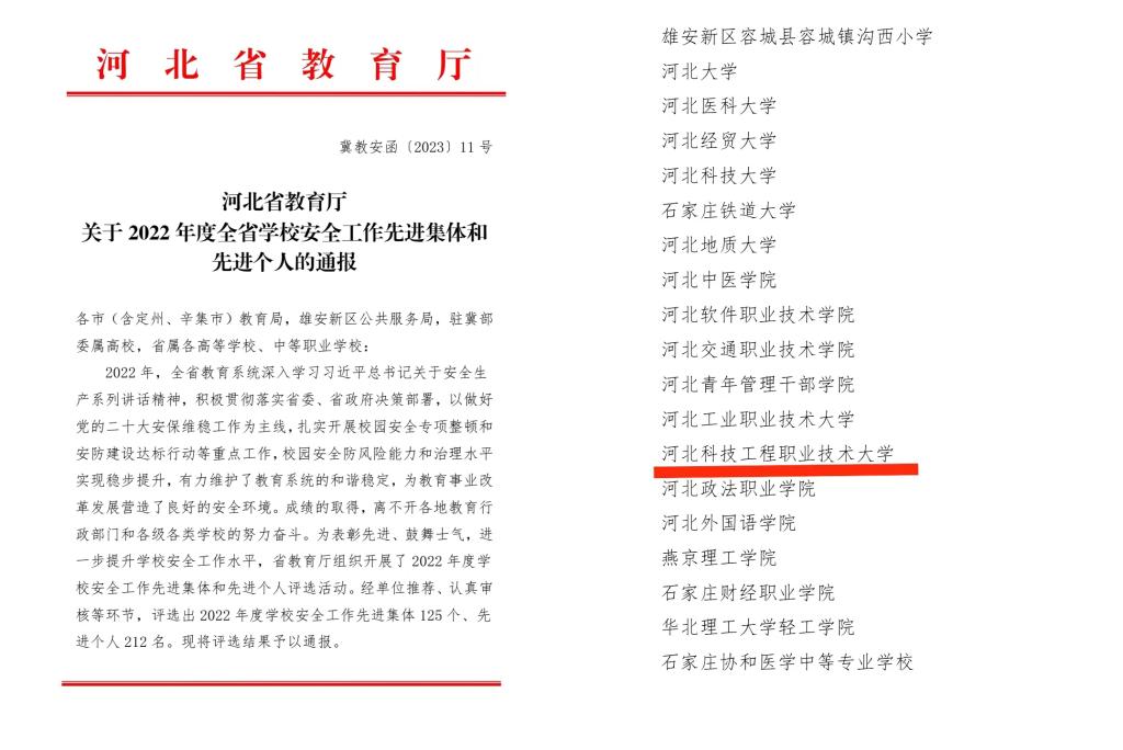 近日,河北省教育厅发布了《关于2022年度全省学校安全工作先进集体和先进个人的通报》,365官网荣获“2022年度河北省学校安全工作先进集体”荣誉称号。至此,学校已连续三年获此殊荣。