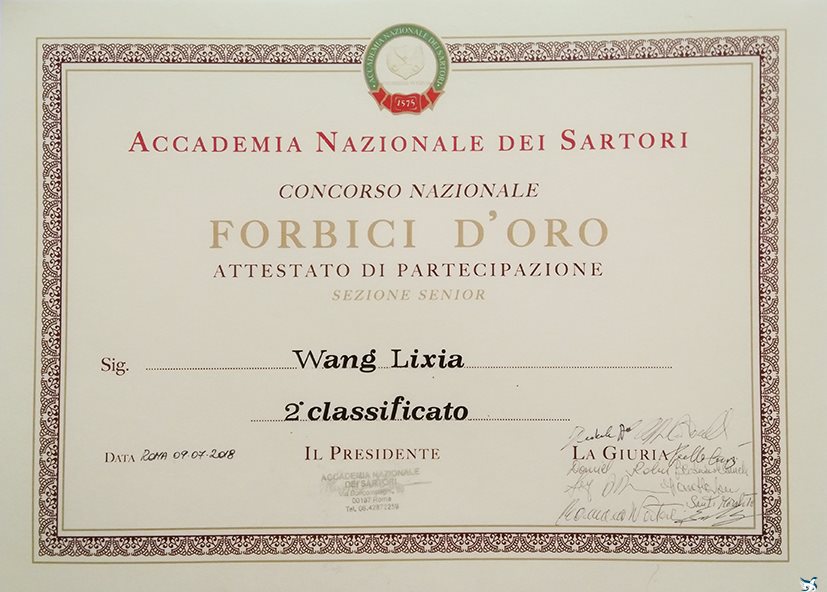 Forbici D`ORO意大利“金剪刀”裁缝师大奖赛决赛于7月9日在意大利罗马落下帷幕,学院服装工程系王丽霞老师喜获二等奖。