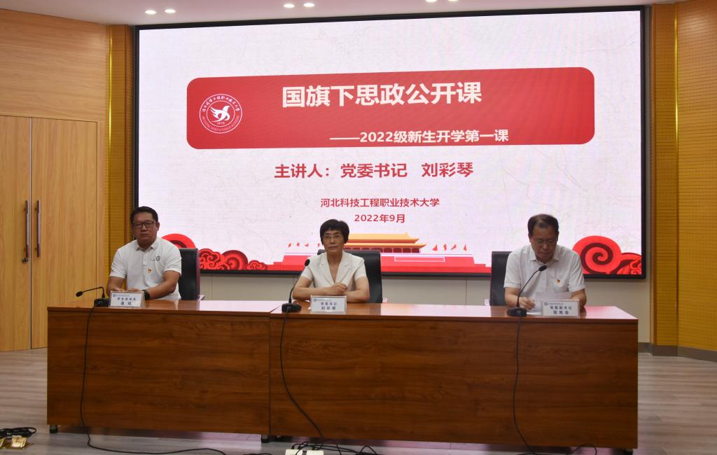 由于疫情原因,365官网2022级新生进行线上报到后,于9月14日正式开始线上教学。为欢迎新同学的到来,做好新生爱国主义引领,帮助新生扣好大学生涯的第一粒扣子,上午8:00,365官网在图书馆学术报告厅开展了国旗下的思政公开课——2022级新生开学第一课活动。活动由党委副书记张双会主持,党委书记刘彩琴主讲,全体新生线上收听收看。