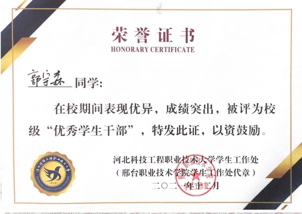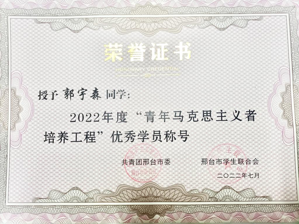 郭宇森是信息工程系计算机网络技术专业2004班学生,担任学校微信公众账号“科工大新青年”编辑、新浪微博河北省份社区主管、学校学生社团微博协会会长。在校期间积极参与国家级、省级、校级各项活动,由于表现突出被授予第四届邢台市“最美大学生称号”、2022年度邢台市“青年马克思主义者培养工程”优秀学员称号、校级“优秀共青团干部”“优秀学生干部”等荣誉称号。