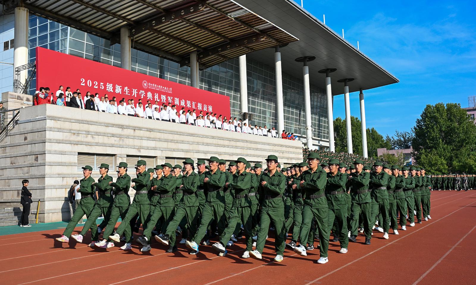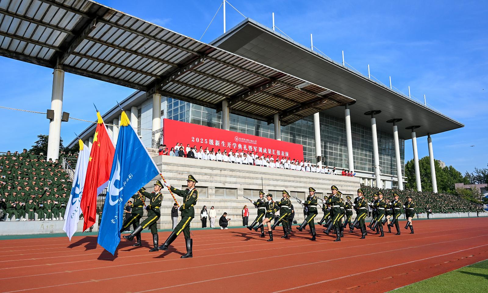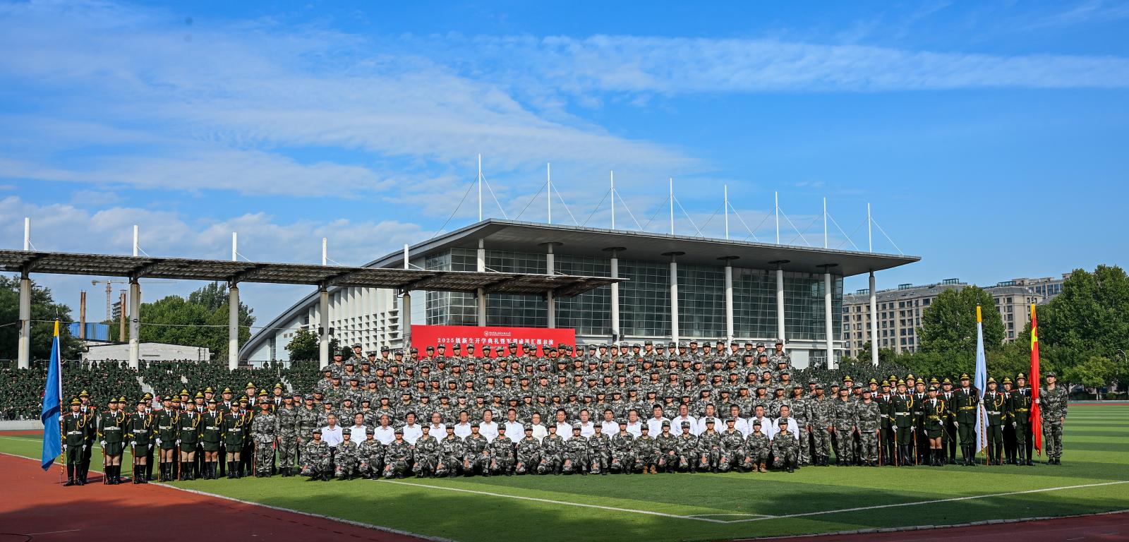 2025级新生开学典礼暨军训成果汇报表演圆满完成,学校领导与全体军训教官合影留念。欢迎全体新科工大人,属于2025级新生的科工大故事正由你提笔酣畅!