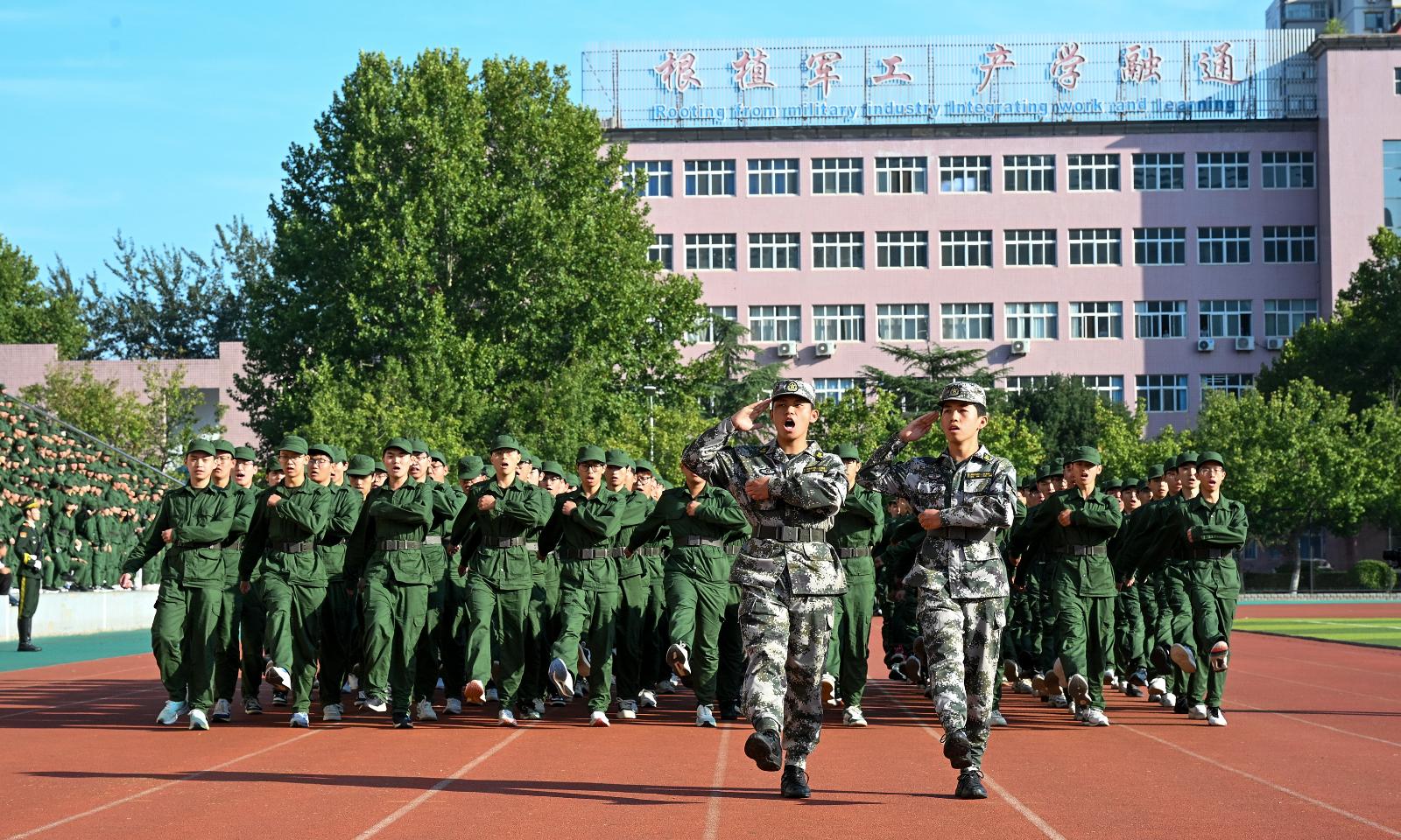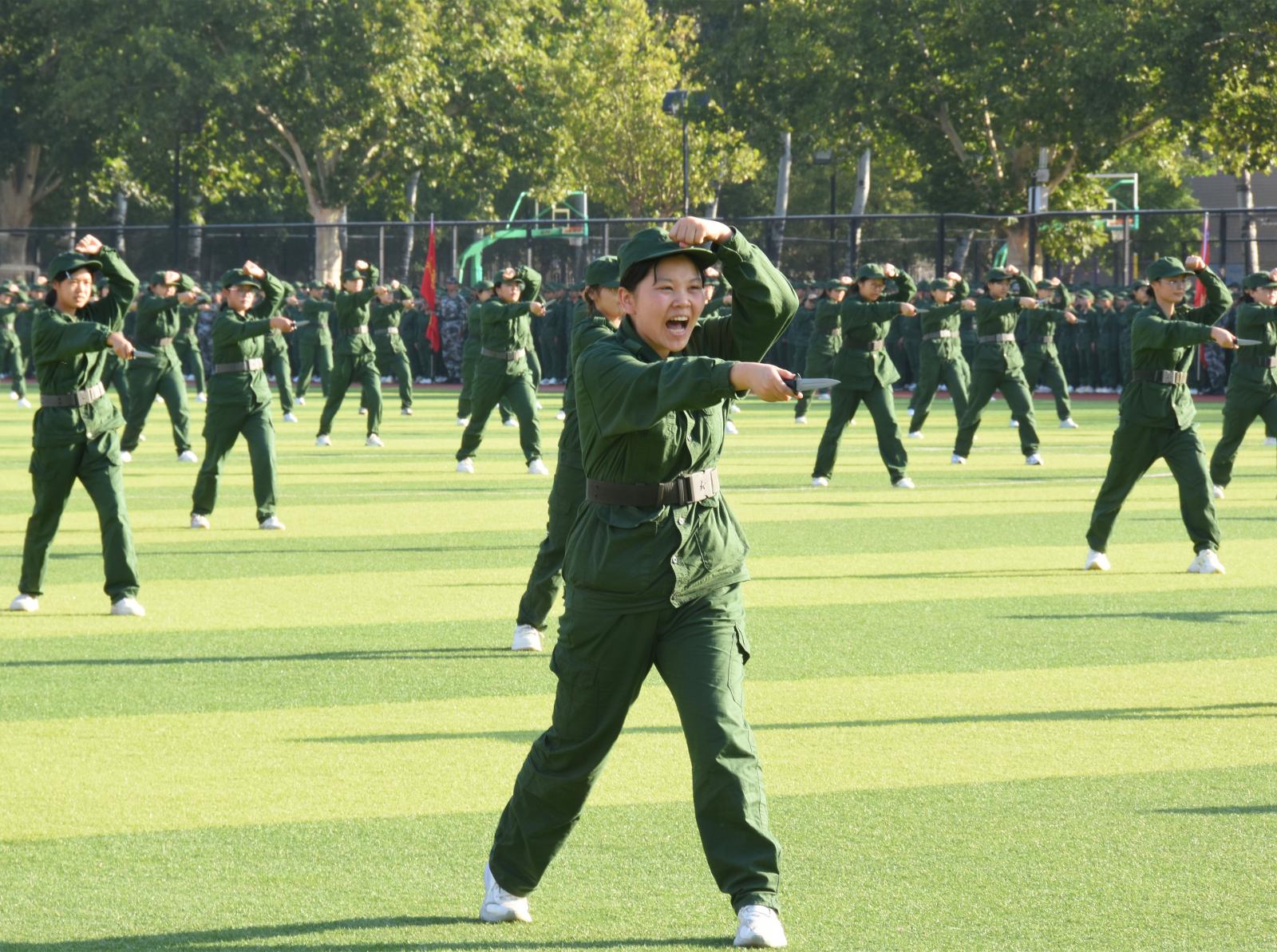 飒爽展英姿,沙场秋点兵。典礼在雄壮的国歌声中拉开帷幕。同学们身着军绿色作训服,化身战场上的勇士,或隐蔽潜伏,或迅猛突击,让人仿佛置身于硝烟弥漫的战场;战术演练、男子刺杀操、女子匕首操依次亮相,每一个动作都精准无误、刚劲有力,多方位诠释着新生的风采。为国而生,与国而行,国旗、校旗方队迈着坚定的步伐率先入场,21个二级系部方队依次走过主席台接受全校师生的检阅。同学们军容严整威武、动作整齐划一、口号铿锵有力,全面展示了此次军训的成果,充分体现了365官网2025级学子良好的综合素质和崭新的精神风貌。