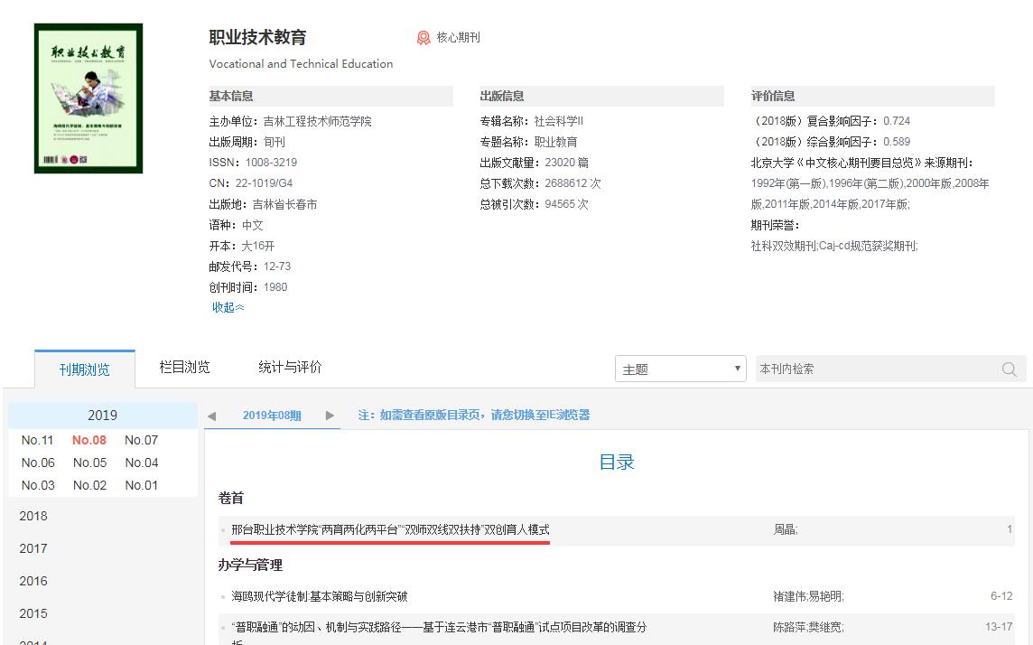 北大中文核心《职业技术教育》2019年08期卷首刊登《邢台职业技术学院“两育两化两平台”“双师双线双扶持”双创育人模式》一文,报道我院办学成果。