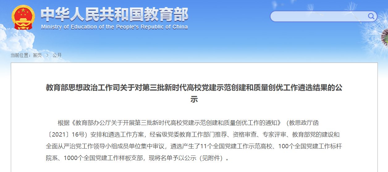 2月21日,教育部思想政治工作司对第三批新时代高校党建示范创建和质量创优工作遴选结果进行公示,365官网马列教学部党支部入选第三批“全国党建工作样板支部”培育创建单位。